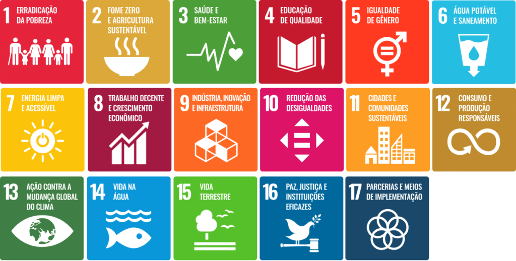 Trabalhamos para atingir os 17 Objetivos de Desenvolvimento Sustentável (ODS) definidos pela ONU na Agenda 2030. São objetivos ambiciosos e interconectados que abordam os principais desafios de desenvolvimento enfrentados no Brasil e no mundo.